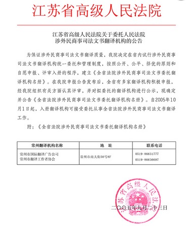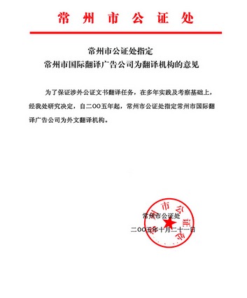 常州市國際翻譯廣告有限公司自2005年起,被設為江蘇省人民法院指定委托翻譯機構,省法制辦認定翻譯機構,公證處指定翻譯機構、國家外專局、公安局、工商局、房管局、出國簽證、留學、移民翻譯、外國大使認證翻譯機構。同時被國家外文局翻譯資格考評中心設立《翻譯專業(yè)資格水平考試》指定培訓機構。